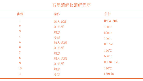 稱取試樣0.2~0.5g(精確到0.1mg)于聚四氟乙烯消解管中,將消解管放入石墨消解裝置石墨孔中。設置消解程序進行消解。消解完畢后冷卻至室溫,然后加入硝酸溶液(1+1)1mL溶解殘渣,轉移至50mL容量瓶中,用少量去離子水洗滌消解罐,洗滌液一并轉移至容量瓶,同時測定消解全程空白。智能石墨消解的消解程序下面見表1。